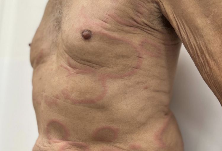 Un patient de 78 ans s’est présenté en consultation dermatologique pour une éruption cutanée prurigineuse évoluant depuis un mois.